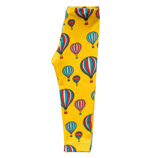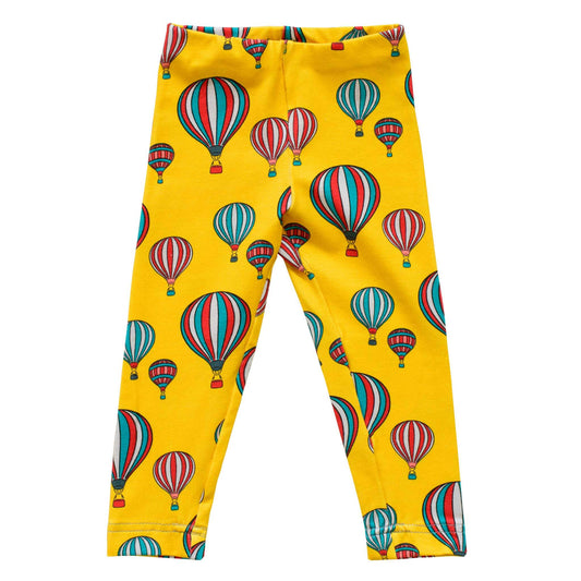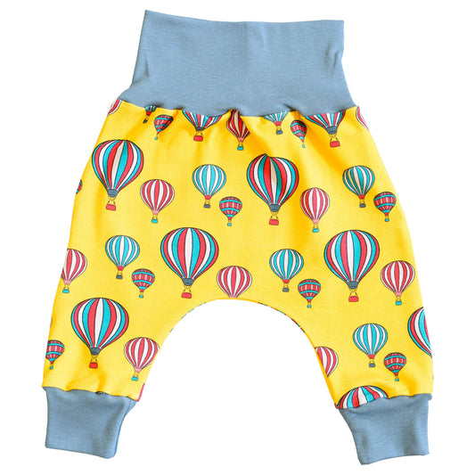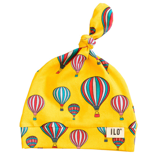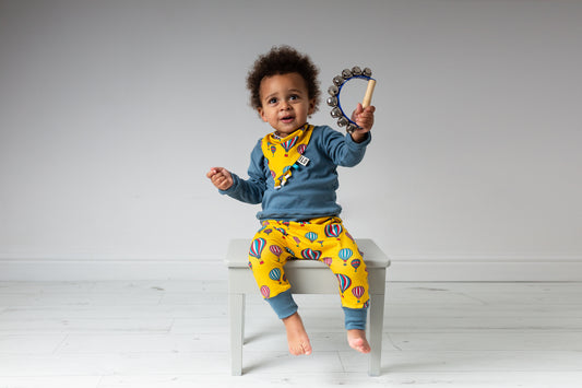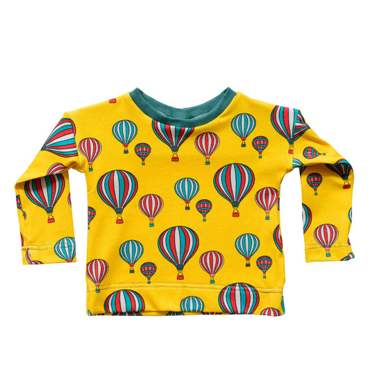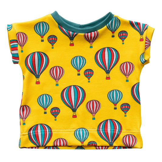 A design of bright yellow children's outfits inspired by the Bristol Balloon Festival. The fabric is adorned with colourful hot air balloons, each with patterns like stripes. This playful design captures the magic and joy of a festive day in the sky.