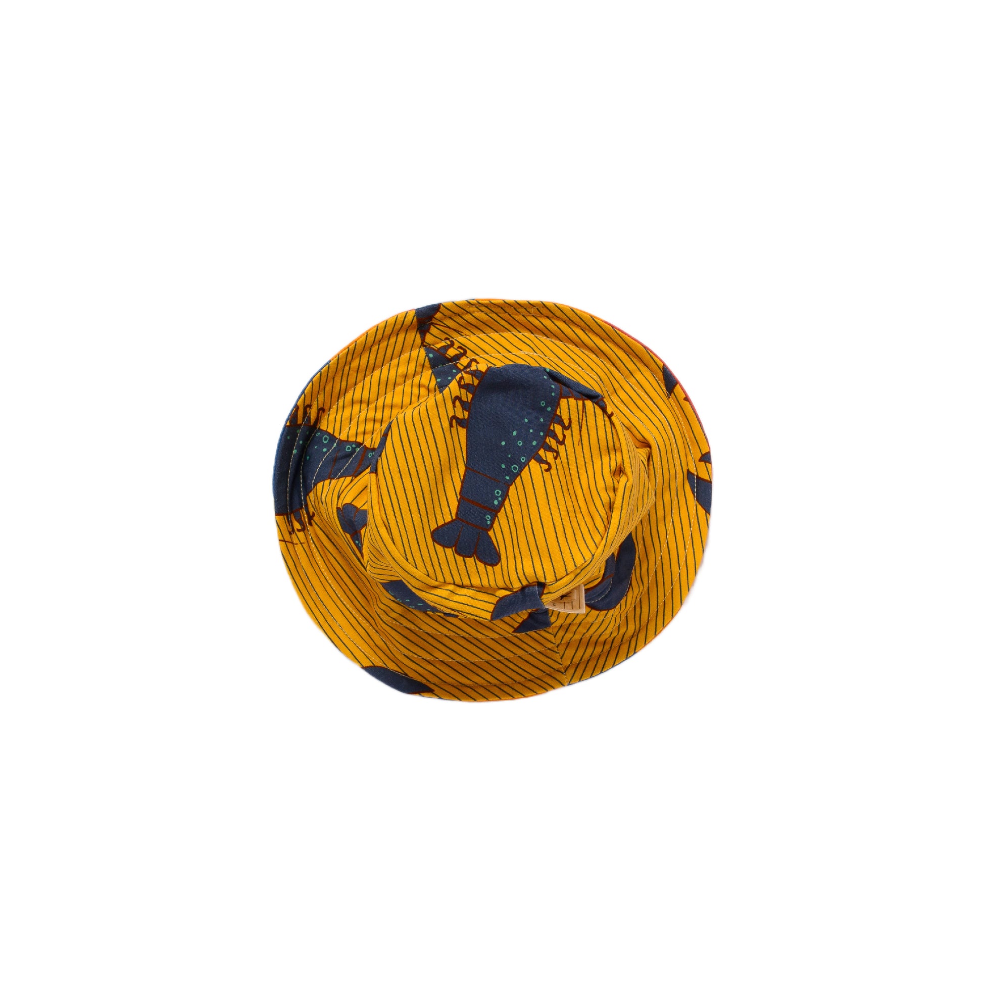 Reversible bucket hat in our exclusive Summer 2023 Blue Lobsters on Gold print. Very long lasting sizes thanks to the flexibility of the material, made with GOTs certified organic cotton jersey, reverse side is a matching stripe print, machine washable @30C