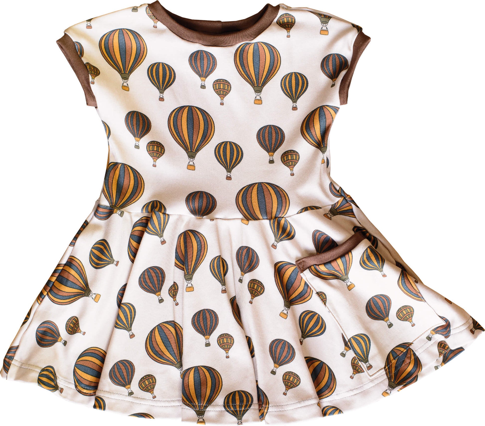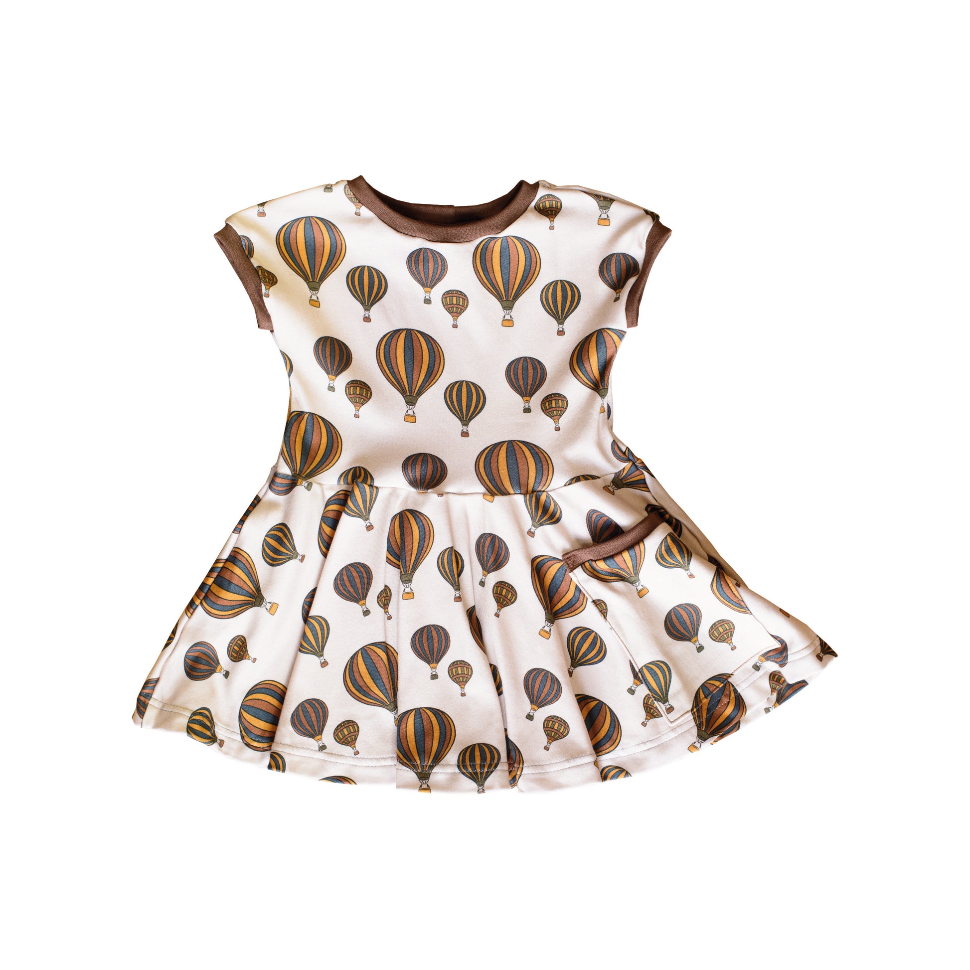 New Hot Air Balloons colourway 'Sand' Skater dress. Includes this very flowy and spinny skirt and 1 side pocket. Box style sleeves allow for longer wear, perfect for wearing on its own or with a long sleeved top underneath.