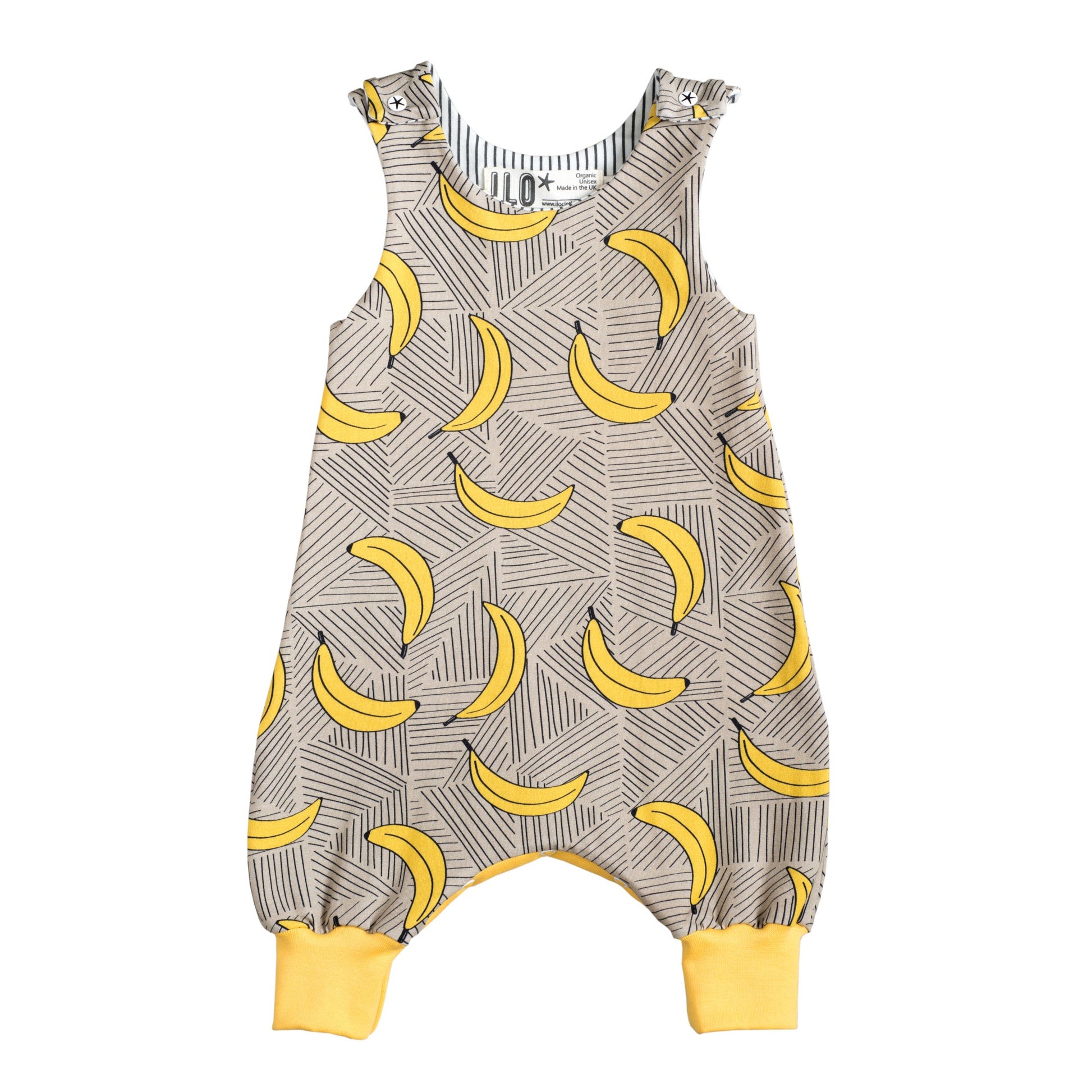 Limited edition Bananas on mushroom print expandable romper. Made with premium organic cotton jersey, includes bottom poppers for easy changing and double shoulder poppers for longer lasting sizing.