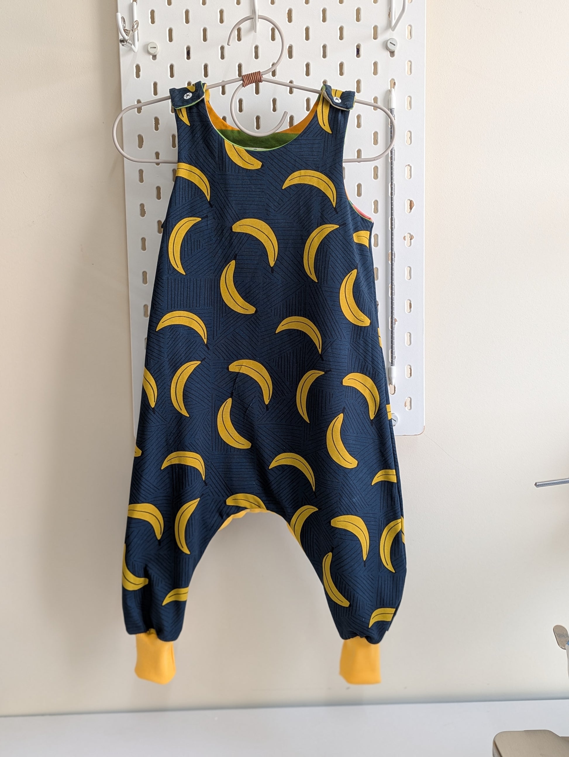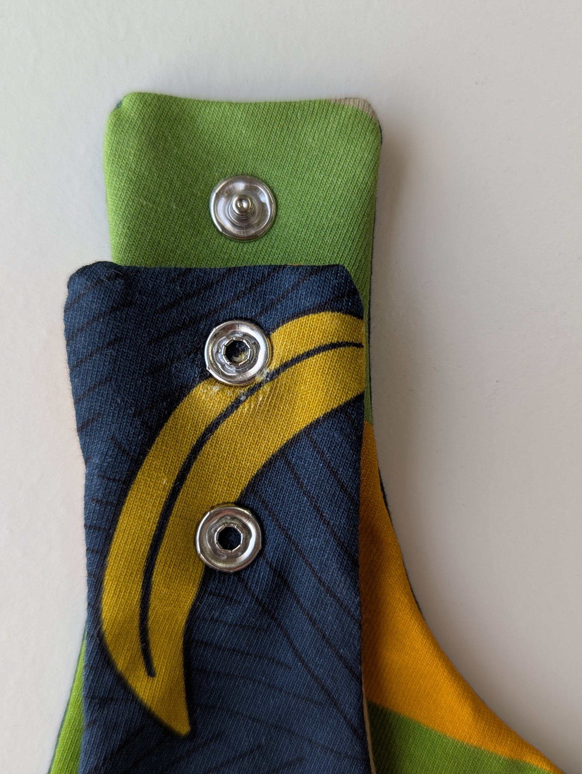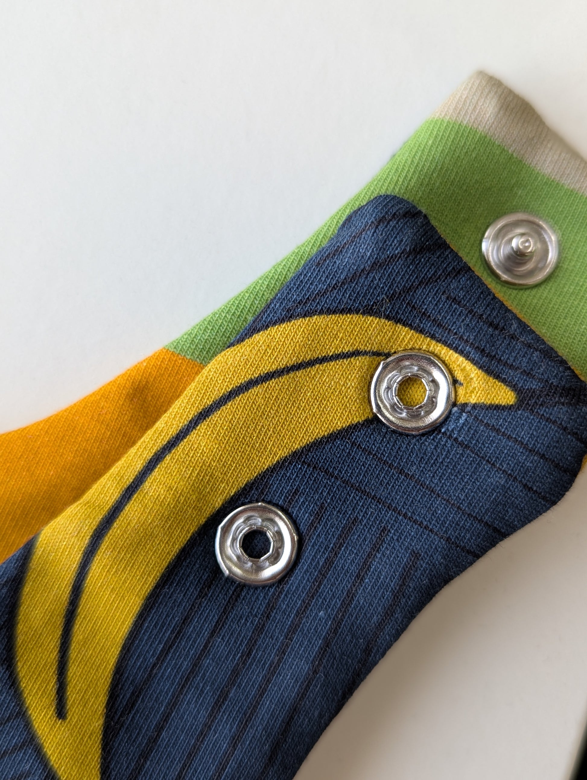 Navy Bananas: 12-36m, fabric around the popper a bit broken, see picture. May not affect functionaly, just needs a little more care when opening/closing.