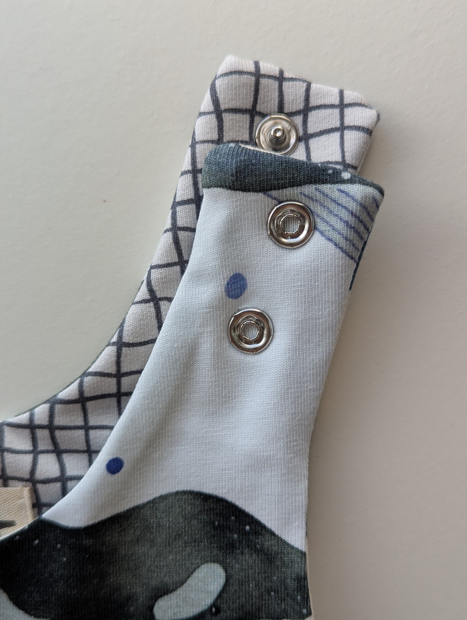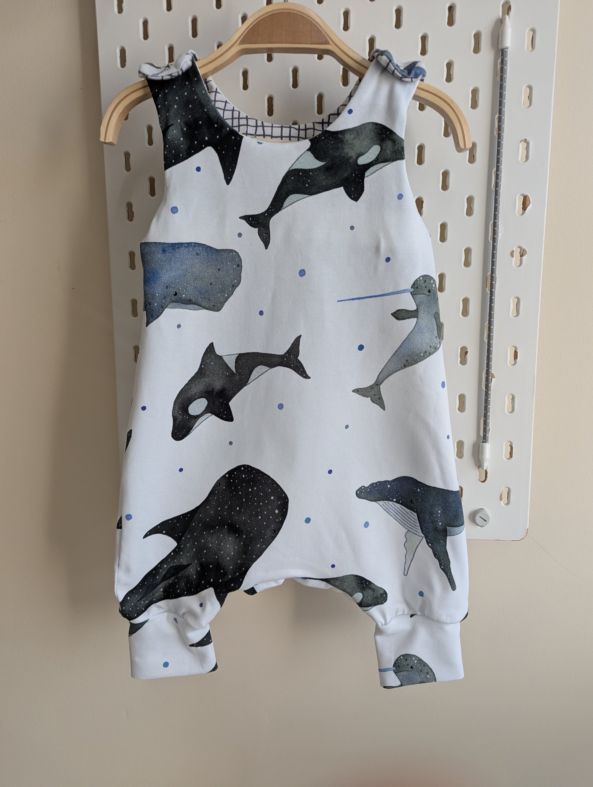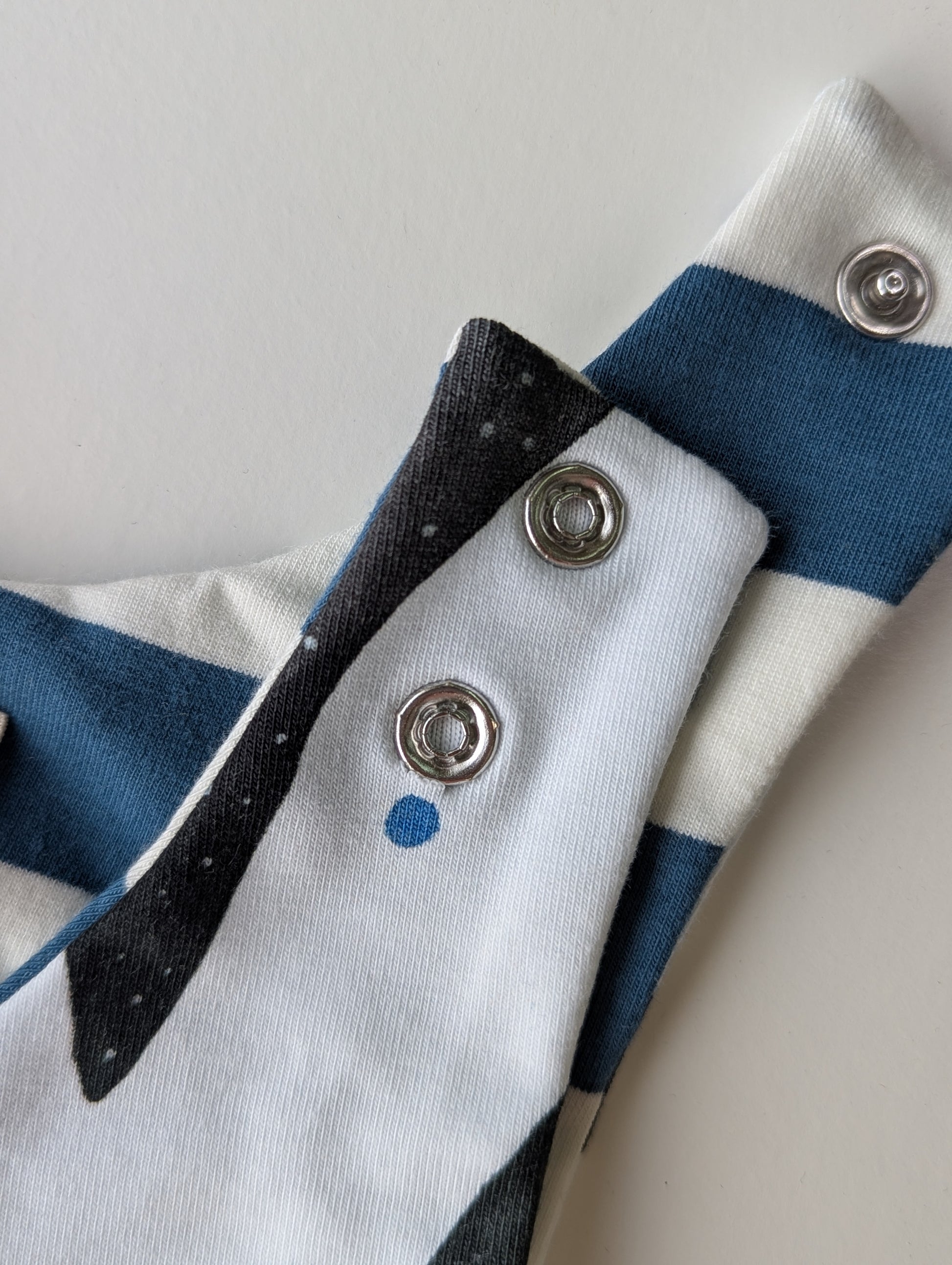 Whales: 0-6m and 6-12m, fabric around the poppers a bit broken, see picture. May not affect functionaly, just needs a little more care when opening/closing.
