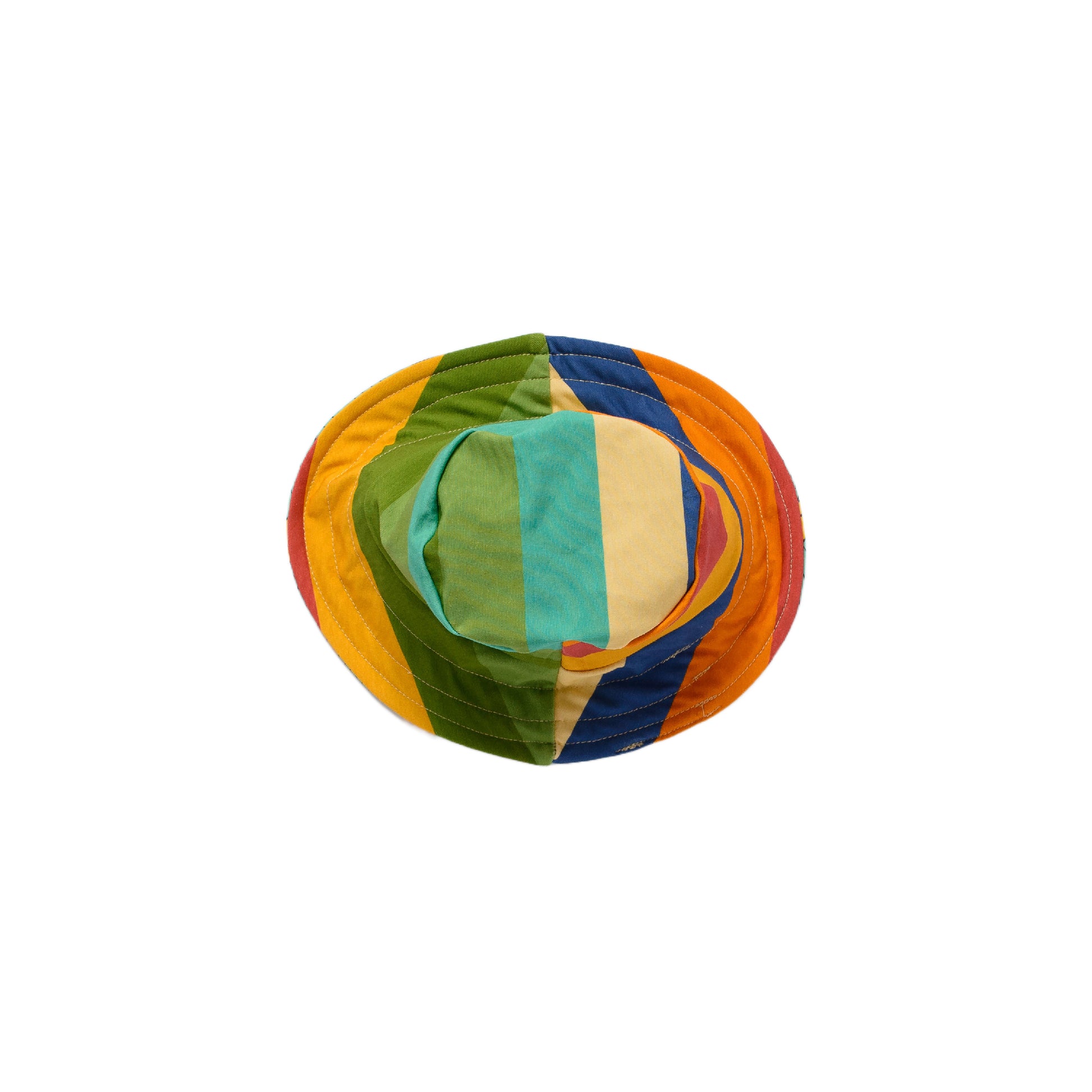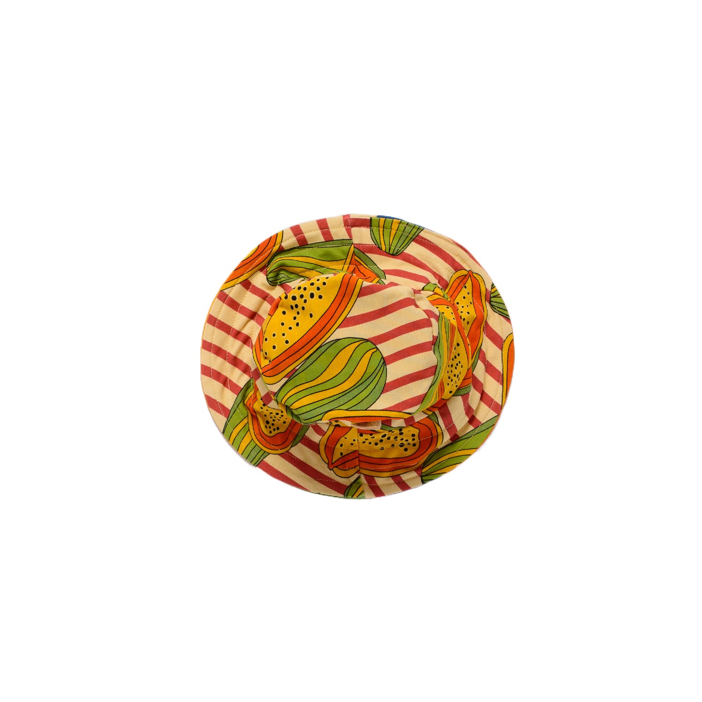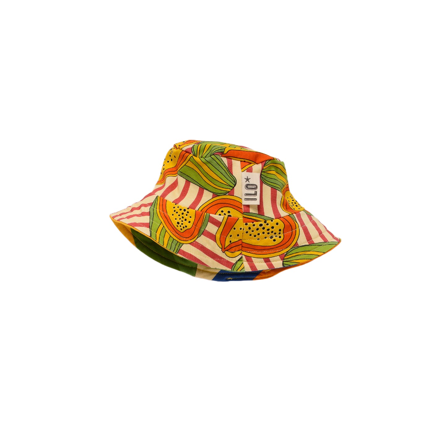 Reversible bucket hat in our exclussive Summer 2023 Papayas print. Very long lasting sizes thanks to the flexibility of the material, made with GOTs certififed organic cotton jersey, reverse side is a matching stripe print, machine washable @30C