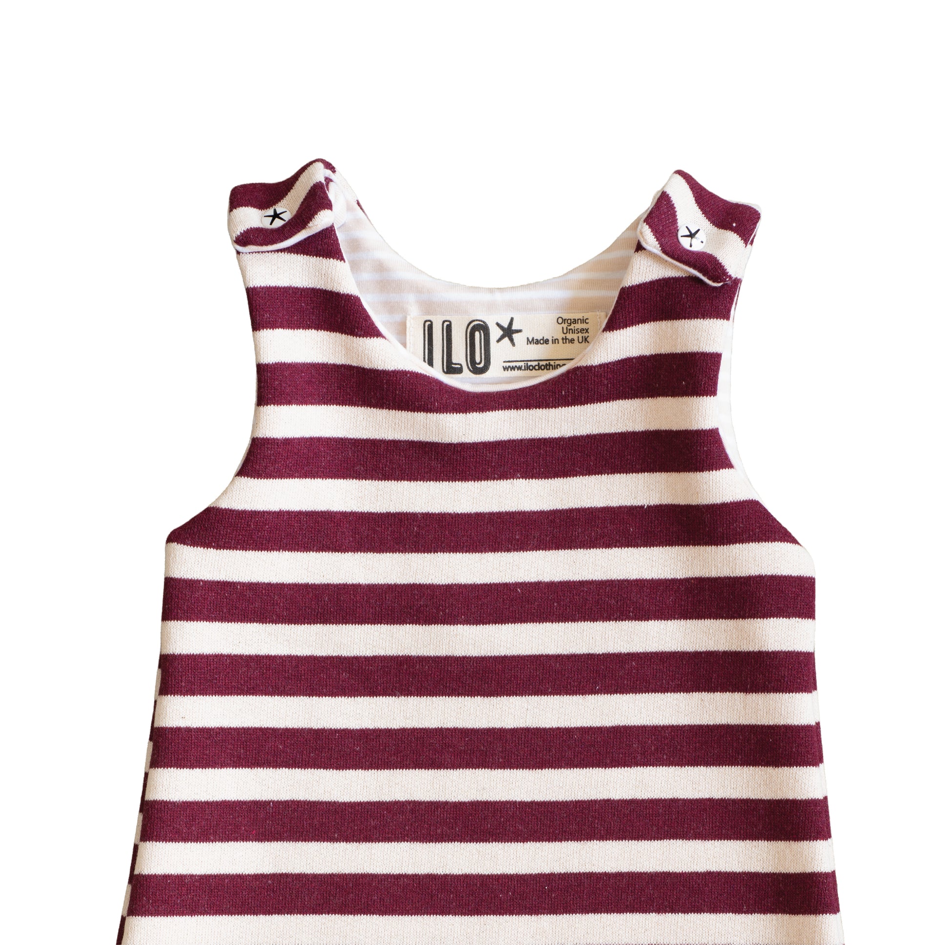 ILO items are handmade in the UK with GOTS certified 95% organic cotton, 5% Elastane unless stated otherwise in the main description. 100% Oeko-Tex certified Stainless steel poppers.
