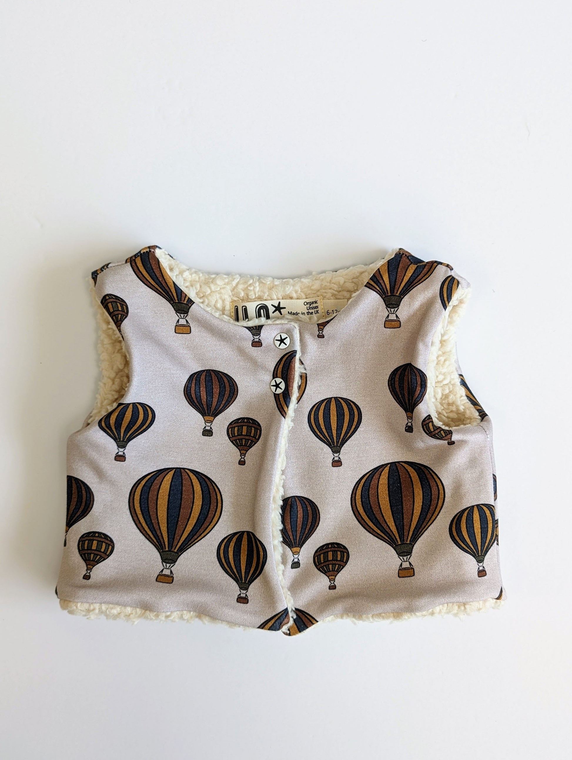 This classic reversible gilet features our bestselling hot air balloons print in the sand colourway and is lined with the fabulous organic cotton plush. It has 2 snap poppers closures.